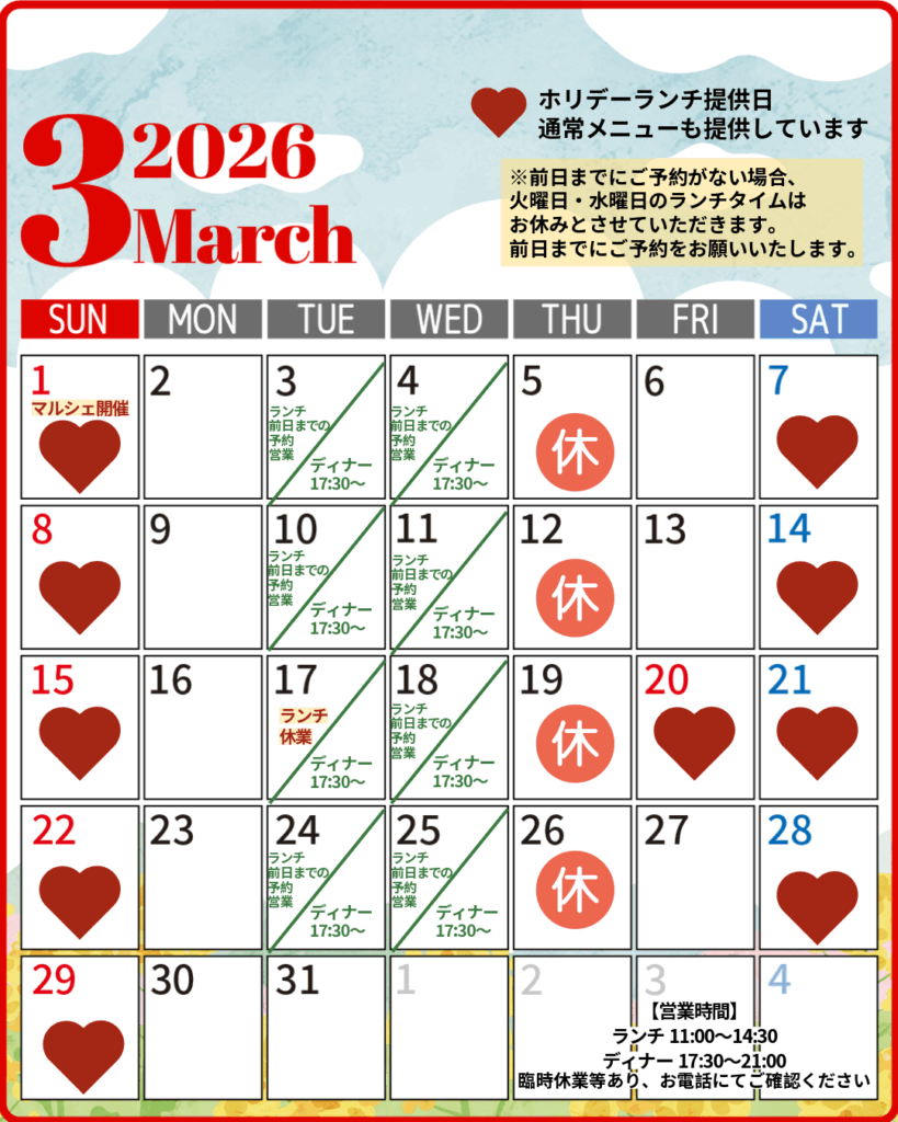 ●前日までにご予約がない場合、火曜日・水曜日のランチタイムはお休みとさせていただきます。ランチ・お弁当のテイクアウトなどをご希望のお客様は、前日までにご予約をお願いいたします。