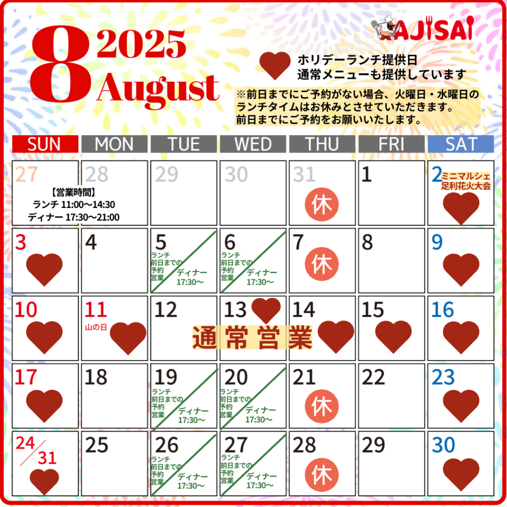 うだるような暑い日が続いていますね😭 食欲もなくなる頃ですが、なるべくしっかり食べてこの夏を乗り切りましょう!AJISAIの8月の予定をお知らせします😊
